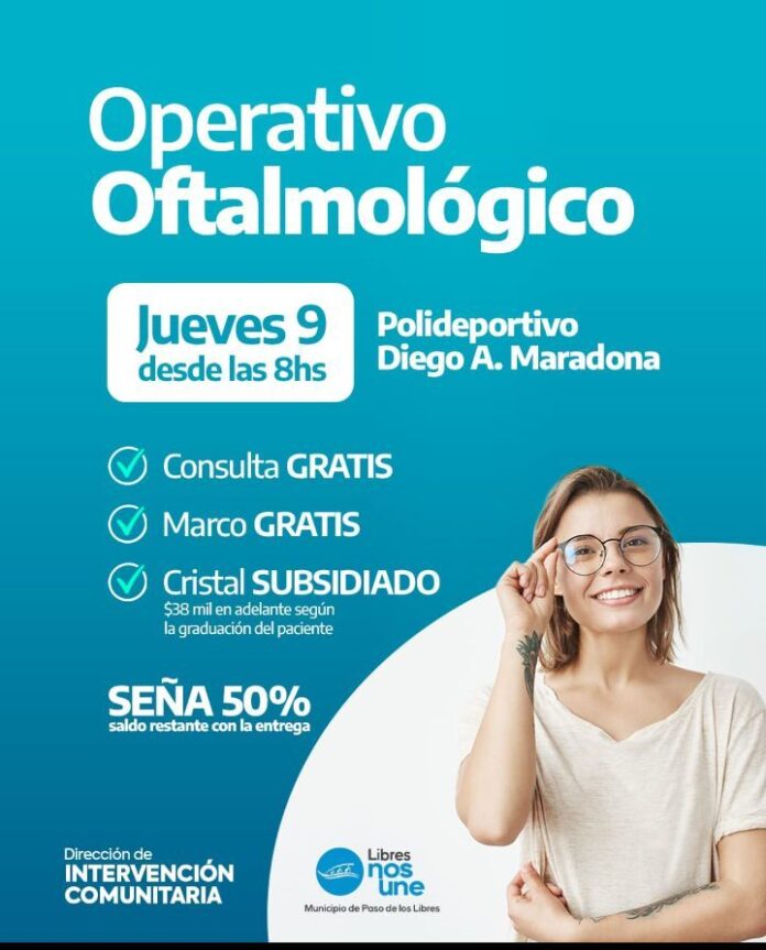 El Municipio de Paso de los Libres, a través de la Dirección de Intervención Comunitaria, llevará adelante un nuevo Operativo Oftalmológico el próximo jueves 9 de octubre desde las 8 horas en el Polideportivo Diego Armando Maradona.