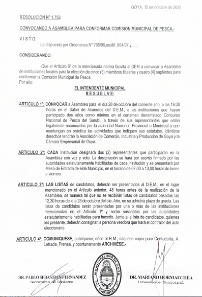 Mediante la Resolución N° 1.753, con las firmas del Intendente doctor Mariano Hormaechea y del Secretario de Gobierno doctor Pablo Fernández, el Departamento Ejecutivo de Goya convoca a las instituciones vinculadas al Concurso Nacional de Pesca del Surubí a participar de una Asamblea el próximo 28 de octubre a las 19:30, en el Salón de Acuerdos del D.E.M., con el fin de elegir a los nuevos integrantes titulares y suplentes de la Comisión Municipal de Pesca. Las listas de candidatos deberán presentarse hasta el 23 de octubre a las 12:30 horas.