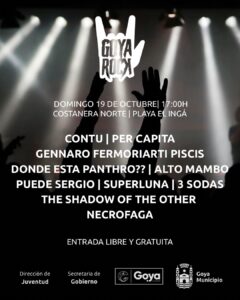 Para el día final del Goya Rock, estarán actuando las siguientes Bandas: Contu; Per Cápita; Genaro Fermoriarti Piscis; Donde Esta Panthro?; Alto Mambo; Puede Sergio; SuperLuna (de Corrientes); Tres Sodas; The Shadow Of The Order y Necrófaga.