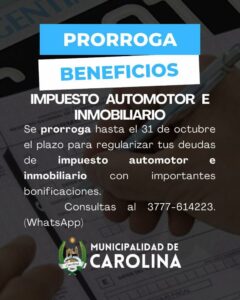 El municipio de Carolina informa de la PRORROGA para realizar el pago de los tributos al Automotor e Inmobiliario hasta el 31 de octubre, esta posibilidad de Prorrogar busca que los contribuyentes puedan lograr con sus tributos entendiendo la situación económica que estamos viviendo.