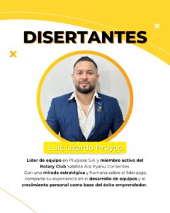 Luis Lizardo Pruyas: Líder en equipo de Pugliese S.A. y miembro activo del Rotary Club Satélite Ará Pyahú (Ctes), con una mirada estratégica y humana sobre el liderazgo, compartirá su experiencia en el desarrollo de equipos y el crecimiento personal como base del éxito emprendedor.