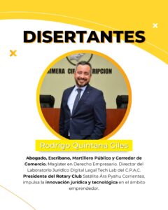 Rodrigo Quintana Ciles: Abogado, escribano público, martillero y corredor de Comercio, magíster en Derecho Empresario, director del Laboratorio Jurídico Digital Legal “Teach Lab del C.P.A.C: presidente del Rotary Club Satélite Ará Pyahú Corrientes, impulsa la innovación jurídica y tecnológica en el ámbito emprendedor.