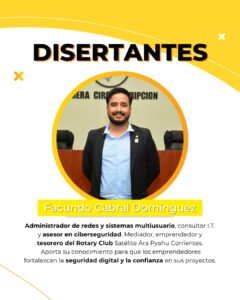 Facundo Cabral Domínguez: Administrador de Redes y Sistemas Multiusuario, consultor I.T. y asesor de Ciberseguridad, mediador, emprendedor y tesorero del Rotary Club Satélite Ará Pyahú Corrientes, aportará su conocimiento para que los emprendedores fortalezcan la seguridad digital y la confianza en sus proyectos.