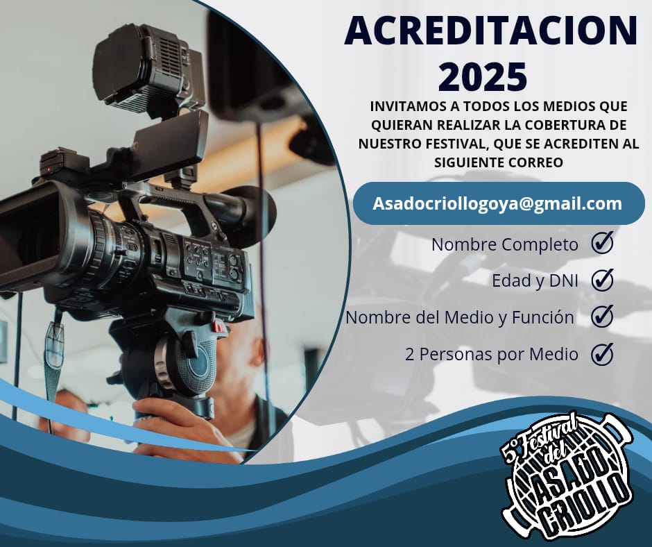 La organización de la 5ª Edición de la Fiesta del Asado Criollo y Concurso de Asadores, evento turístico gastronómico y cultural, a llevarse a cabo del 7 al 9 de noviembre de 2025 en predio Costa Surubí, comunica que se encuentra abierto el periodo de acreditación para los Medios de Prensa interesados en realizar la cobertura del evento.