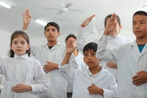 Los alumnos interpretaron el Himno Nacional Argentino en lenguaje de señas, en un gesto de profundo simbolismo inclusivo, y el acto contó con la bendición del diácono seminarista Guillermo Cañete.