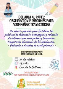 En la continuidad del programa establecido el CIEE, propone para el próximo viernes 24, a las 18 y 30 horas en Casa de la Cultura, el tema: Del Aula al Papel; Observación e Informe para acompañar trayectoria, destinados a docentes del nivel primario.