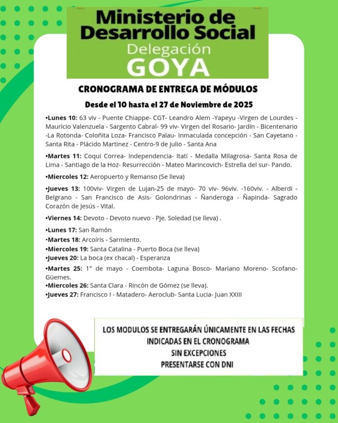 La Delegación Goya de Desarrollo Social informa el cronograma de entrega de módulos alimentarios desde el 6 de octubre hasta el 23 de octubre de 2025. Los módulos se entregarán únicamente en las fechas indicadas en el cronograma. Sin excepciones, presentarse con DNI.
