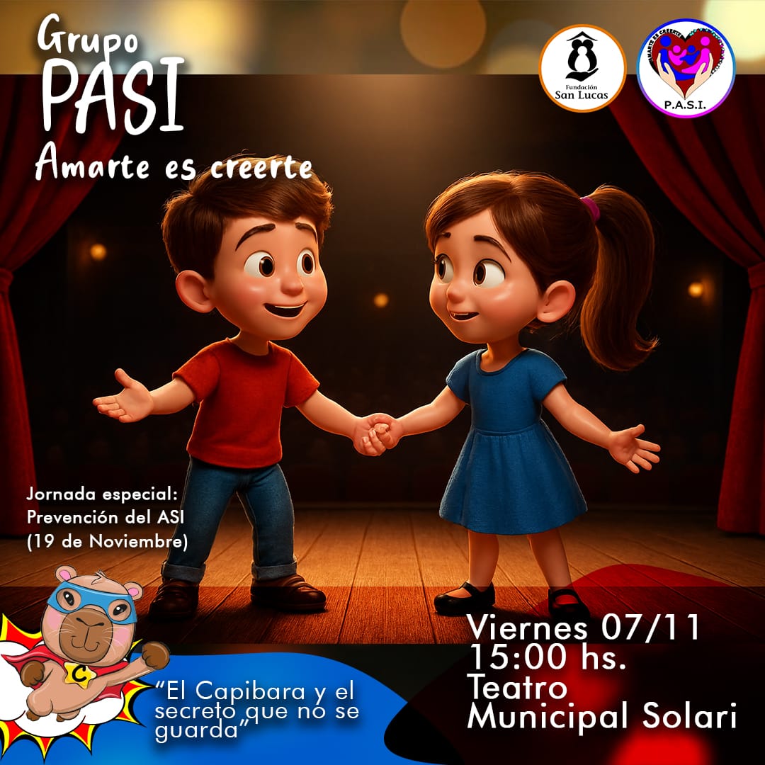 El viernes 7 de noviembre, a las 15 horas en una funciona especial, el Grupo PASI, de la Fundación San Lucas recreará la obra “El Capibara y el Secreto que no se Guarda”, en el Teatro Municipal