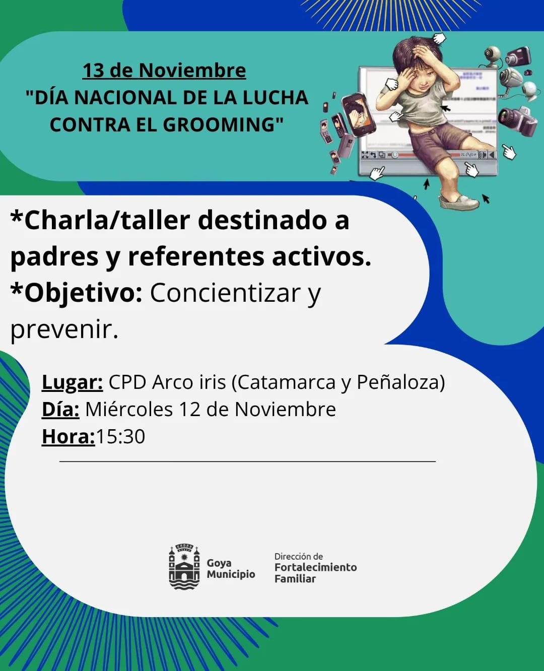 Cada 13 de noviembre en Argentina se conmemora el Día Nacional de la Lucha contra el Grooming, fecha instituida por la Ley 26.904, que busca visibilizar y prevenir el acoso de menores a través de internet. En este contexto, la Dirección de Fortalecimiento Familiar de la Municipalidad de Goya promueve una charla informativa y preventiva dirigida a padres, madres y cuidadores, que se realizará este miércoles 12 de noviembre a las 15.30 en el Centro de Promoción de Derechos Arcoíris, ubicado en Catamarca y Peñaloza.