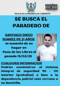 Desde el primer momento en que se tomó conocimiento de la ausencia del ciudadano SUÁREZ DIEGO SANTIAGO, de 21 años de edad, domiciliado en la localidad de Paso de los Libres y quien se habría ausentado de su hogar el 15-02-25, la Policía de Corrientes intensificó de manera inmediata el operativo de búsqueda, articulando recursos y personal especializado, la cual se sigue realizando.