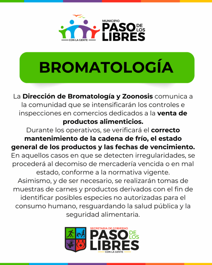La Municipalidad de Paso de los Libres, a través de la Dirección de Bromatología y Zoonosis, informa a la comunidad que se intensificarán los controles e inspecciones en los comercios dedicados a la venta de productos alimenticios, con el objetivo de resguardar la salud pública y garantizar la seguridad alimentaria.