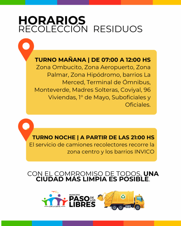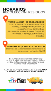 La Municipalidad de Paso de los Libres, a través de la Secretaría de Obras y Servicios Públicos, recuerda a los vecinos los horarios y recorridos del servicio de recolección de residuos domiciliarios, con el objetivo de fortalecer el orden, la limpieza y el cuidado del espacio público.