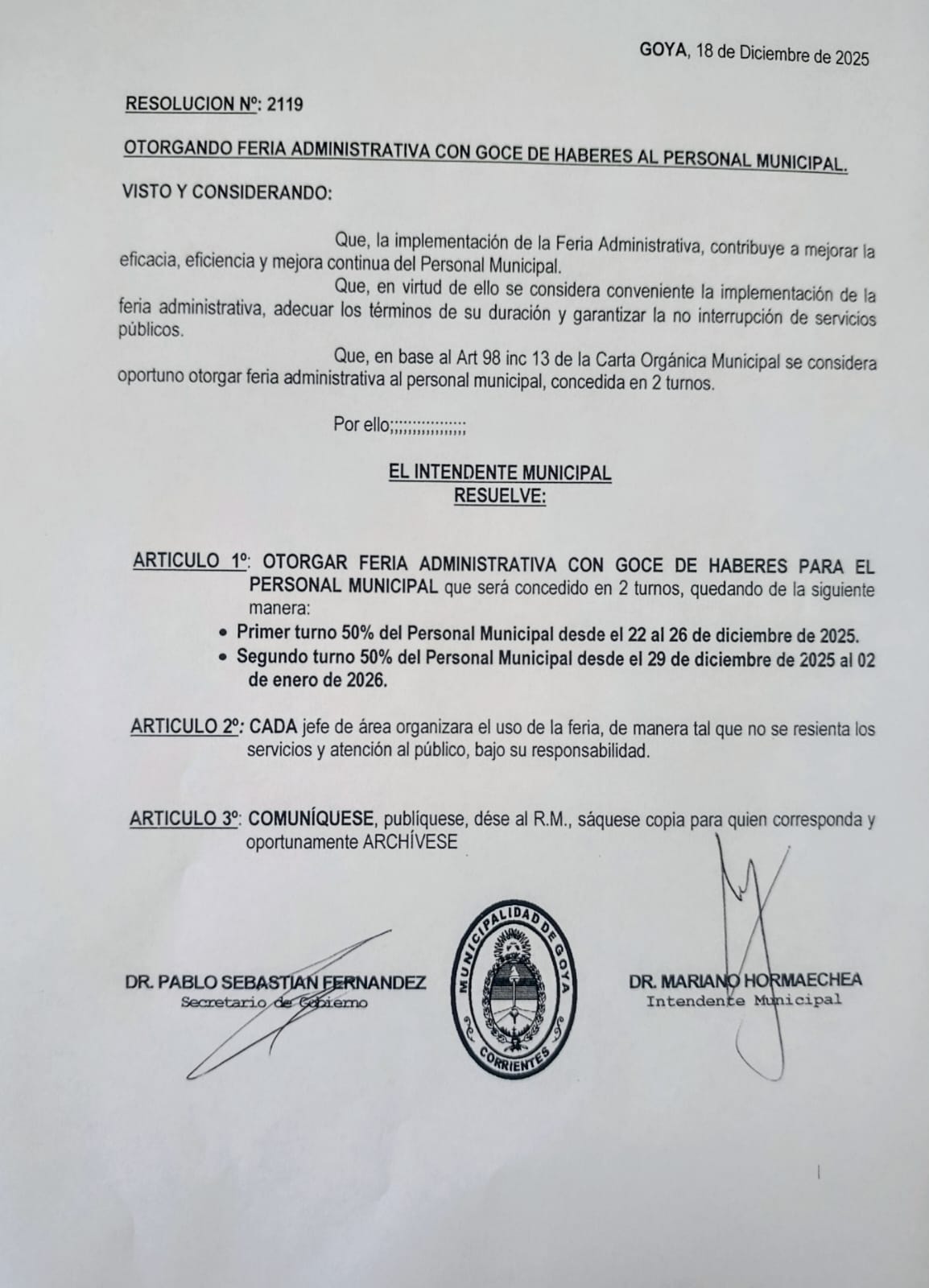 RESOLUCIÓN N°: 2119 OTORGANDO FERIA ADMINISTRATIVA CON GOCE DE HABERES AL PERSONAL MUNICIPAL