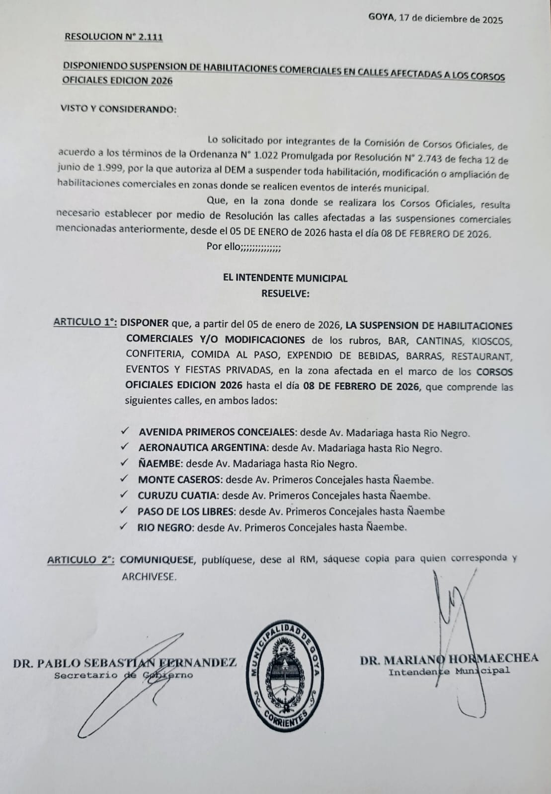A través de la Resolución N° 2.111 se dispuso que, a partir del 05 de enero de 2026, la Suspensión de Habilitaciones Comerciales y/o modificaciones de los rubros, bar, cantinas, kioscos, confitería, comida al paso, expendio de bebidas, barras, restaurant, eventos y fiestas privadas, en la zona afectada en el marco de los Corsos Oficiales edición 2026 hasta el día 08 de febrero de 2026, que comprende las siguientes calles, en ambos lados: