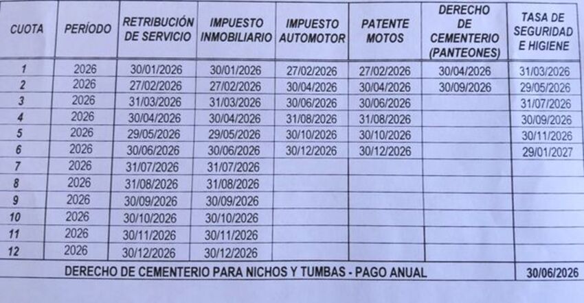 Vencimientos del calendario de: Impuesto: Automotor; Impuesto Inmobiliario; Retribución de Servicios; Patente motos, Tasa de Seguridad e Higiene, Derecho Cementerio año 2026
