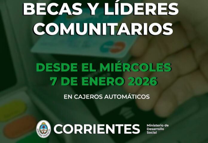 El Gobierno de Corrientes comunica a los beneficiarios de becas y líderes comunitarios del Ministerio de Desarrollo Social, un bono extraordinario que estará disponible en cajeros automáticos desde este miércoles 7 de enero.