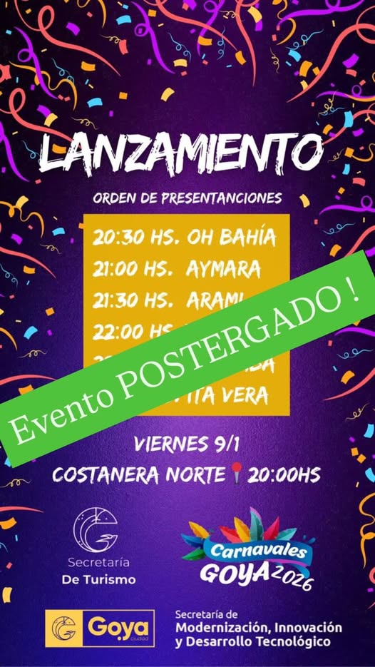 De esta manera a causa de las intensas precipitaciones registradas en Goya, se ha reprogramado la presentación de los corsos oficiales de la ciudad, domingo 11 desde las 19 horas, con entrada libre y gratuita, en Costanera Norte; Playa El Inga.