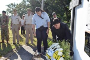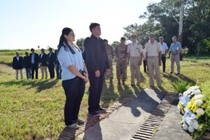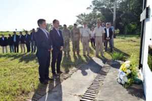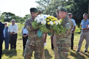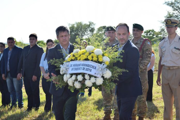 Finalizado el discurso, se procedió a la colocación de ofrendas florales en homenaje a los héroes de la Batalla de Ñaembé. El gesto estuvo a cargo del intendente Mariano Hormaechea y el viceintendente Sebastián Mazzaro por el municipio de Goya; la intendenta Andrea Alarcón y el viceintendente Diego Espina por Colonia Carolina; y los representantes del Batallón de Ingenieros de Monte 12, el teniente coronel Sergio Ortiz y el suboficial mayor Julio Ortiz.