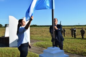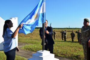 La ceremonia dio inicio con el izamiento de la Bandera Nacional, a cargo del intendente Hormaechea, la intendenta Alarcón y el teniente coronel Ortiz, en un marco de profundo respeto y solemnidad.