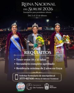 La Secretaría de Turismo informó sobre la apertura de la inscripción para postulantes a Reina Nacional del Surubí 2026: del 2 al 22 de febrero. Mirá todos los requisitos y pedí el formulario al 3777-627416. Sumate a esta posibilidad de ser la nueva gran embajadora de Goya.