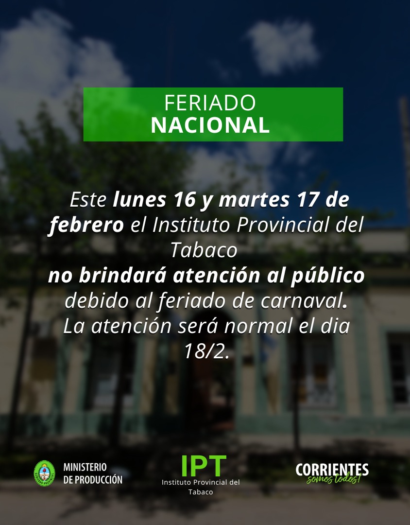 LOCALES El IPT recuerda que no habrá atención en el feriado de carnaval 13 febrero, 2026 FacebookTwitterPinterestWhatsApp El Instituto Provincial del Tabaco recuerda que los días lunes 16 y martes 17 de febrero sus dependencias permanecerán cerradas debido al Feriado de Carnaval, sin atención al público, retomando la actividad el miércoles 18, en su horario habitual.