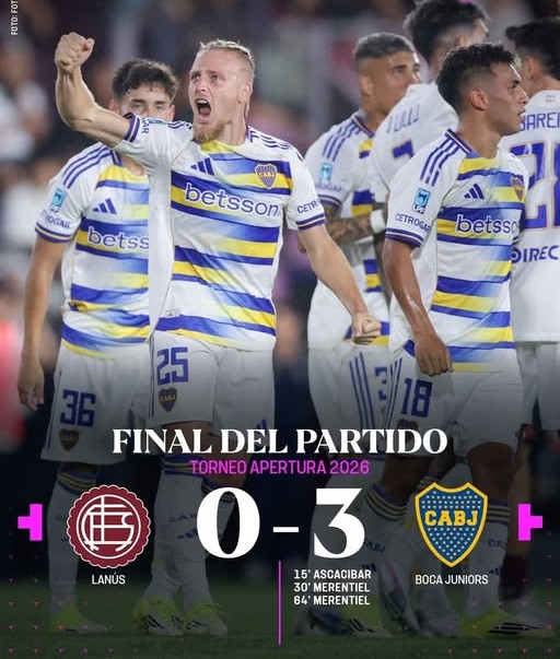 NA – Boca superó de punta a punta y goleó por 3-0 a Lanús, reciente campeón de la Recopa Sudamericana 2026, en un partido que disputaron en el estadio Néstor Díaz Pérez, que adeudaban de la séptima fecha del Torneo Apertura 2026.