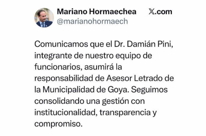 En la información descrita en sus redes, señala: “Comunicamos que el Dr. Damián Pini integrante de nuestro equipo de funcionarios, asumirá la responsabilidad de Asesor Letrado de la Municipalidad de Goya. Seguimos consolidando una gestión con institucionalidad, transparencia y compromiso”. #Goya hacia Adelante.