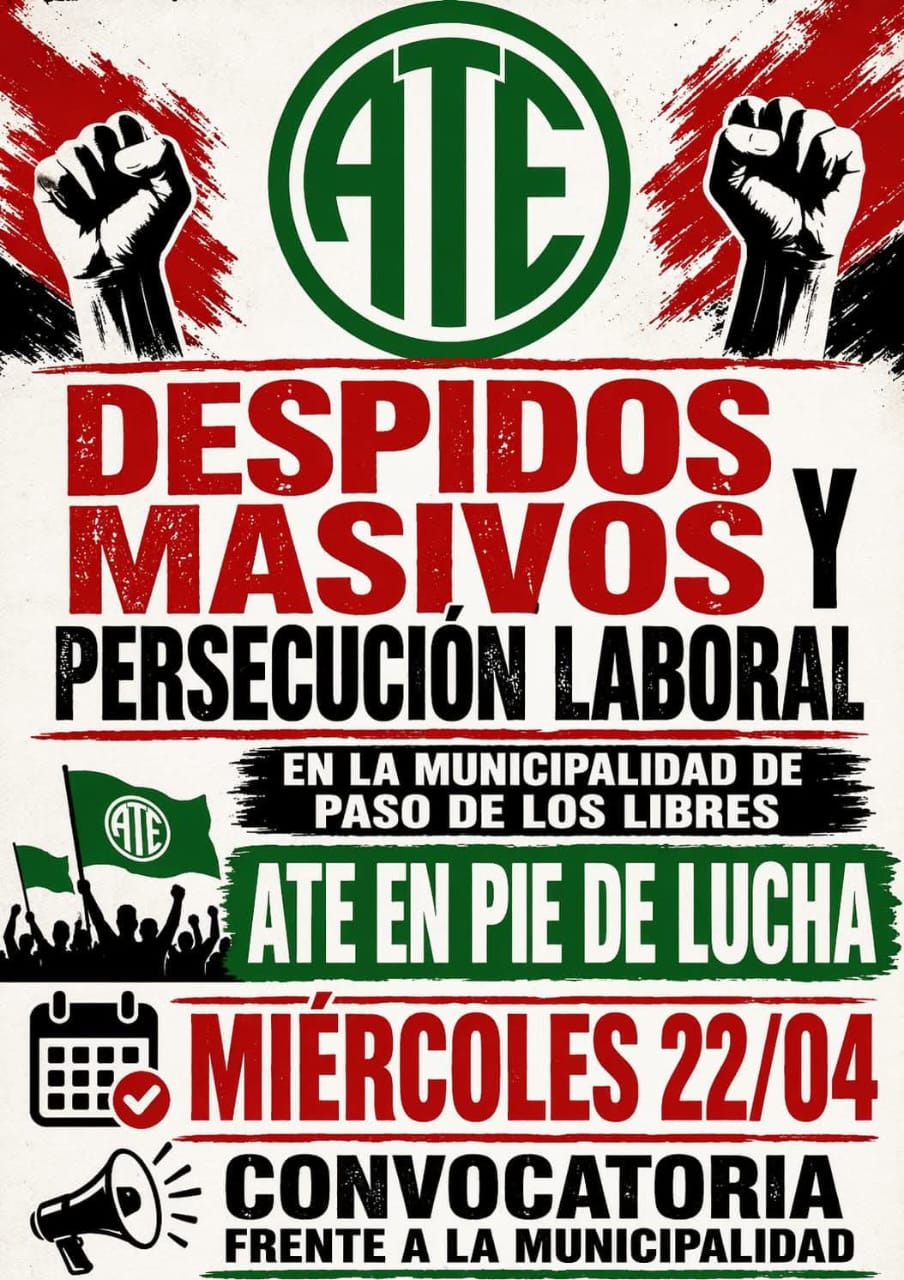 Mediante una pieza gráfica difundida en redes, ATE expresó su inquietud por la situación que atraviesa parte del personal municipal y declaró el estado de alerta y asamblea permanente. En ese marco, confirmó una movilización para el miércoles 22 de abril, con punto de encuentro frente al Palacio Municipal, bajo la consigna “ATE en pie de lucha”.