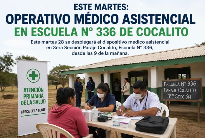 LOCALES Operativo médico asistencial en Escuela N° 336 de paraje Cocalito 28 abril, 2026 FacebookTwitterPinterestWhatsApp Este martes 28 se desplegará el dispositivo medico asistencial en 3era Sección Paraje Cocalito, Escuela N° 336, desde las 9 de la mañana.